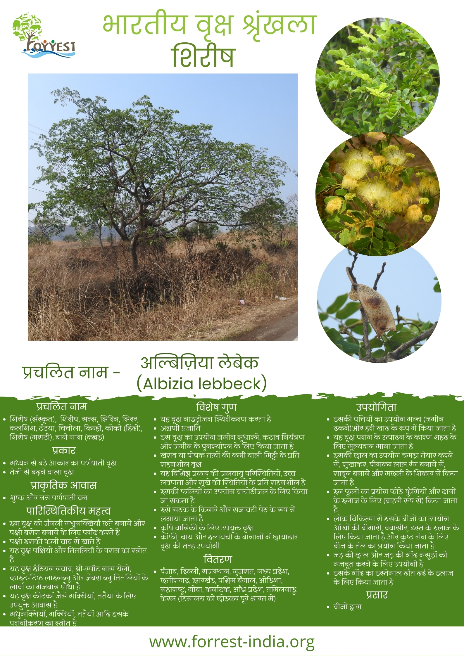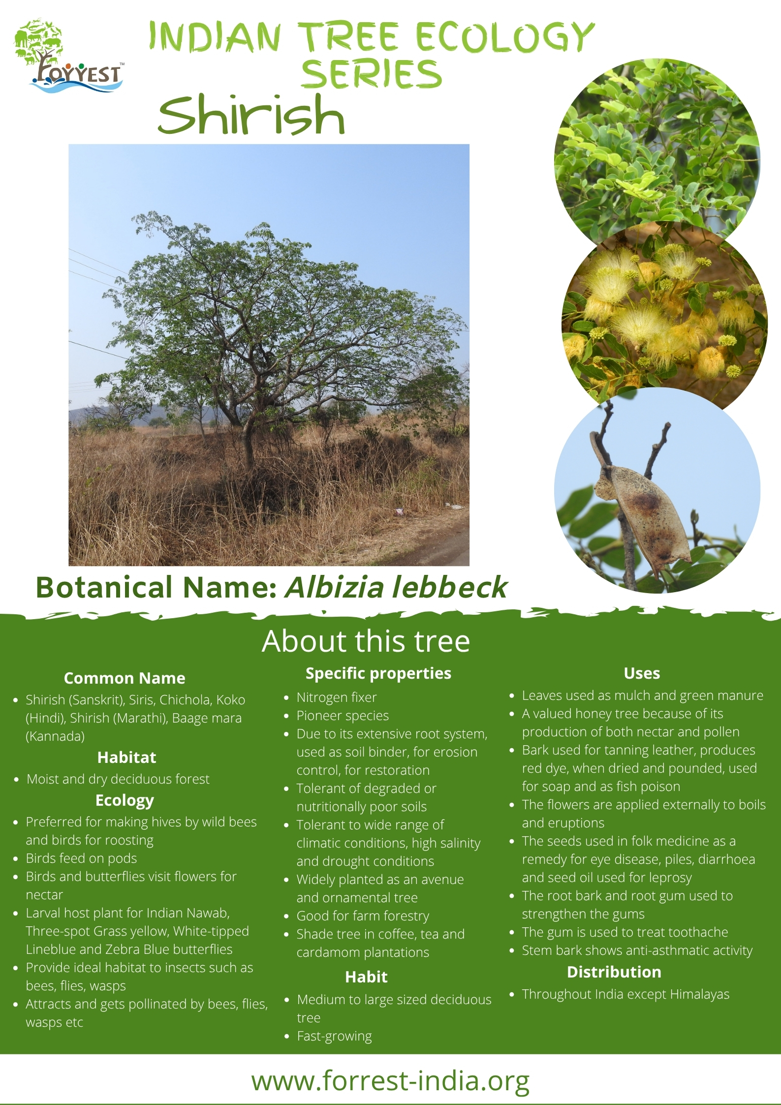 Common Name – Shirish (Sanskrit), Siris, Siras, Sirin, Sirar, Kalshish, Tantia, Chichola, Kinhi, Koko (Hindi), Shirish (Marathi), Baage mara (Kannada)