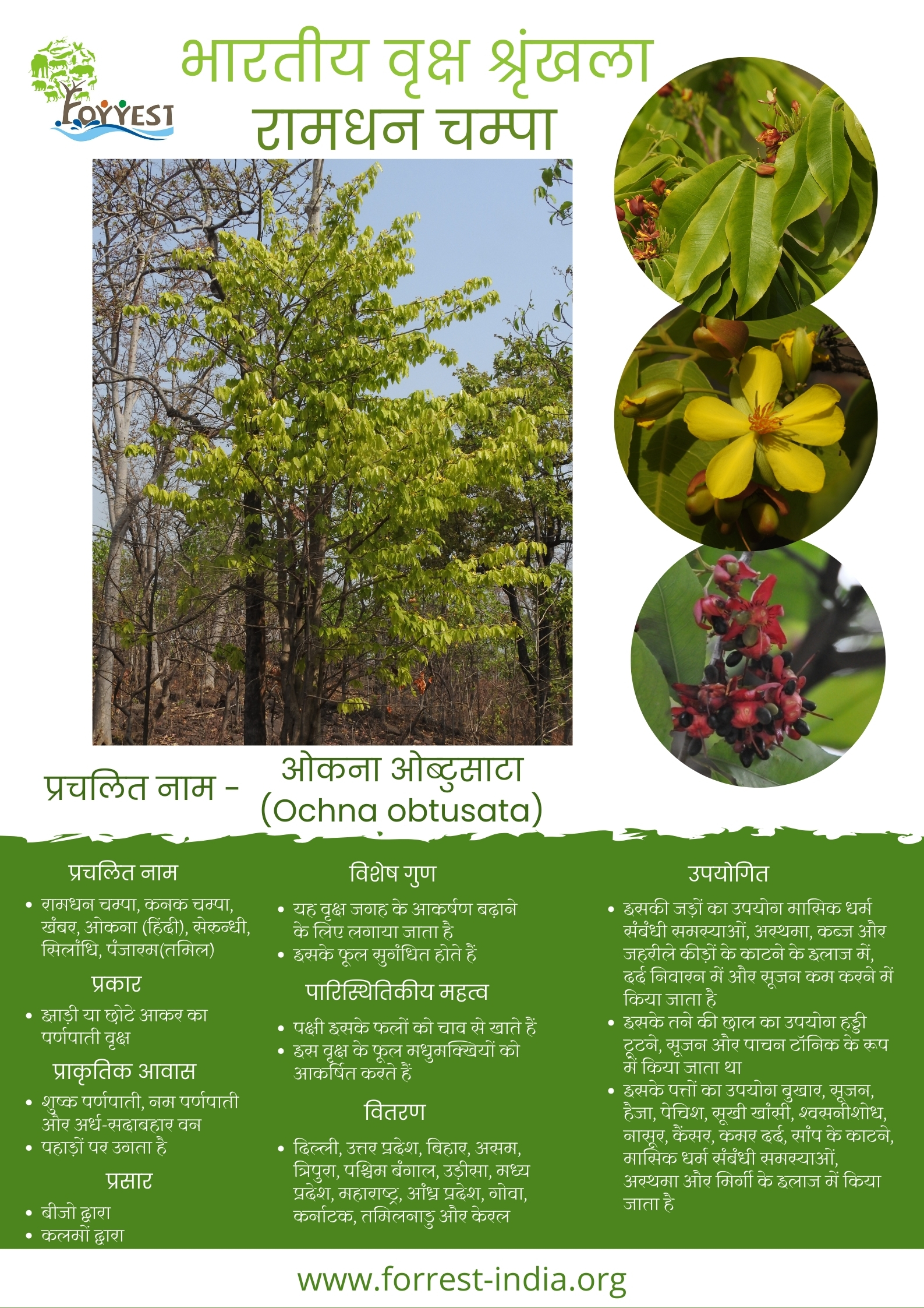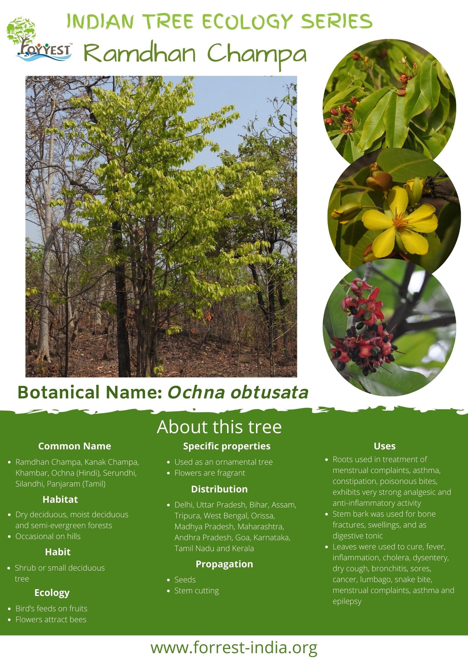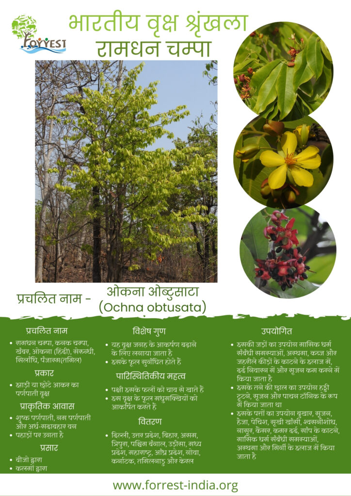 Common Name – Ramdhan Champa, Kanak Champa, Khambar, Ochna (Hindi), Serundhi, Silandhi, Panjaram (Tamil)